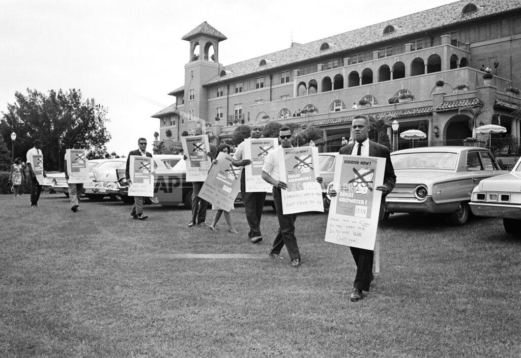 Some of the President’s words seemed to be aimed at his opponent for the Presidency, Senator Barry Goldwater, but he did not name him. Speaking of the fighting in Vietnam, Mr. Johnson said that some persons “are eager to enlarge the conflict.” He called that view reckless and said it might “risk the lives of millions.” On the racial situation, the President said that law and order can be maintained only if we continue to work “toward racial justice.” Then, in what many took as a shaft at Senator Goldwater, he said: “Those who would hold back progress toward equality, and at the same time promise racial peace, are deluding themselves and the people.”