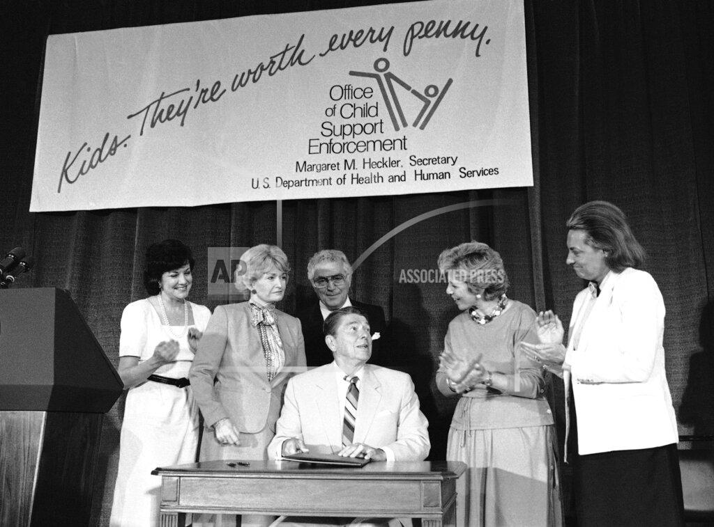 President Reagan participates in a signing ceremony for H.R. 4325, the Child Support Enforcement Act of 1984. Child support payments will be enforced under a comprehensive bill signed by President Reagan. The measure, which was approved by unanimous roll-call votes in both chambers of Congress, would, in many cases, compel employers to withhold funds from pay when a parent is one month late in making court-ordered support payments.