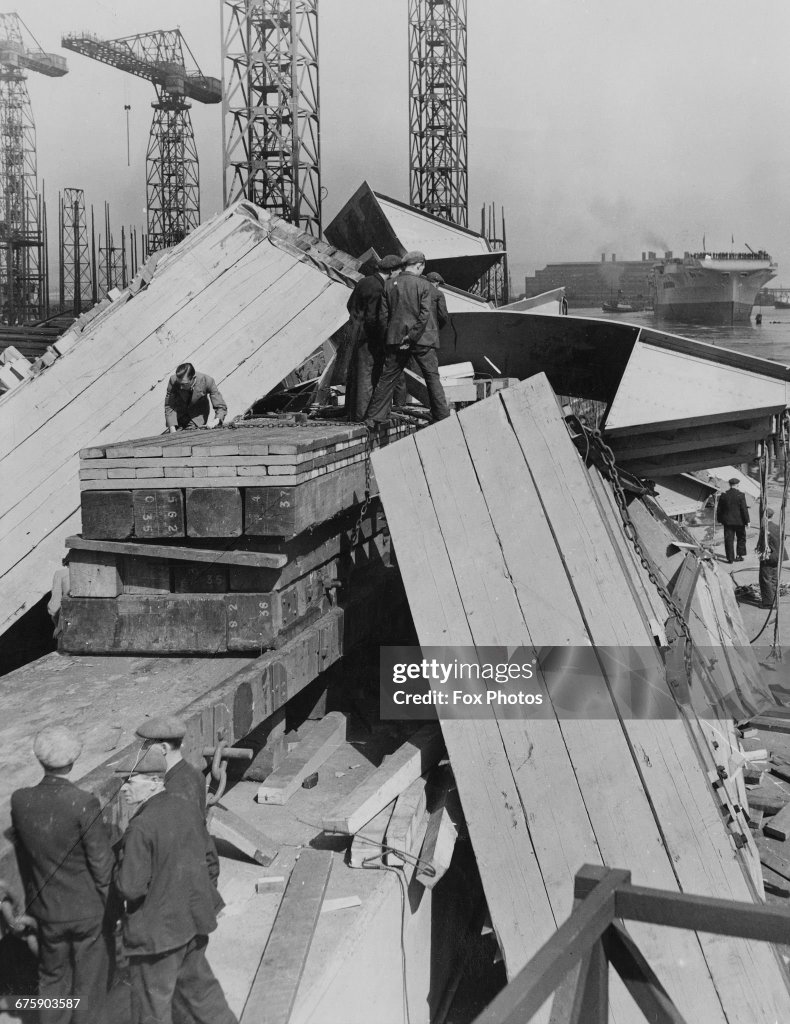 Lady Wood, Air Minister Sir Kingsley Wood’s wife, who had just arrived on the platform to perform the naming ceremony, hurled a bottle of wine after the retreating ship and then burst into tears as workmen rushed amid the wreckage searching for injured mates. Scores of shipwrights, who were under the vessel knocking away at the keel blocks, were trapped between the launching ways as it thundered over them. They escaped death by inches.