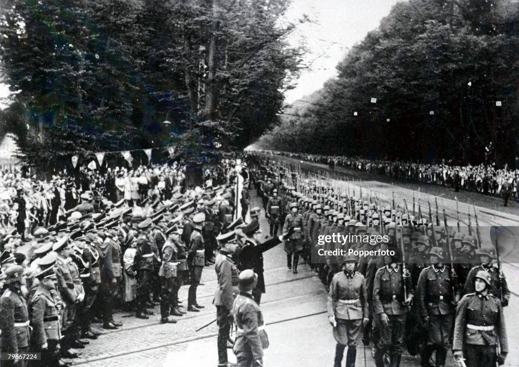German Chancellor Adolf Hitler receives the telegram from Soviet Marshal Josef Stalin, acknowledging agreement on a non-aggression pact. Hitler, who was having dinner with Eva Braun and guests at the time the message arrived, responds by banging his fist on the dinner table, exclaiming “I have them! I have them!” (This is in reference to his diplomatic out-maneuvering of the British and French.)