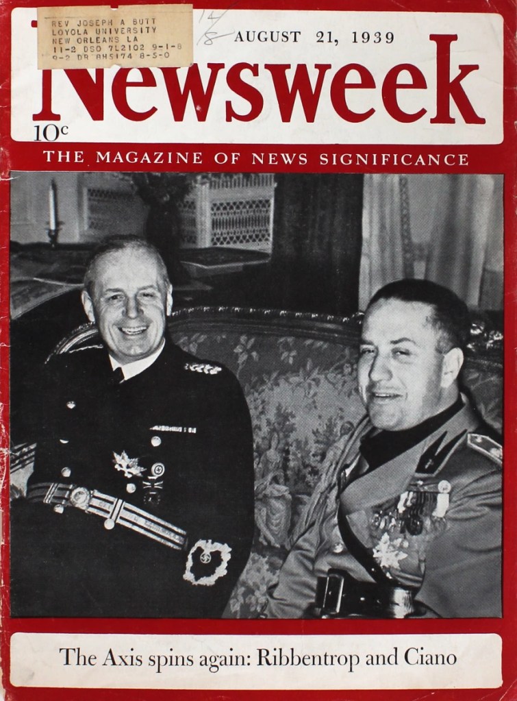 German Chancellor Adolf Hitler threw another bombshell into the camp of those trying to halt him when it was officially announced here last night that Germany and Soviet Russia had agreed to conclude a non-aggression pact and that Foreign Minister Joachim von Ribbentrop, author of the anti-Comintern pact, would arrive in Moscow Wednesday to “conclude the negotiations.” This announcement, distributed throughout Germany by extra editions of newspapers, was hailed with supreme elation as a great diplomatic victory over Britain because it was taken to mean the end of the Anglo-French-Russian alliance negotiations and the collapse of Britain’s “encirclement” policy, lifting from German minds the specter of the Russian steamroller in case of a new war.