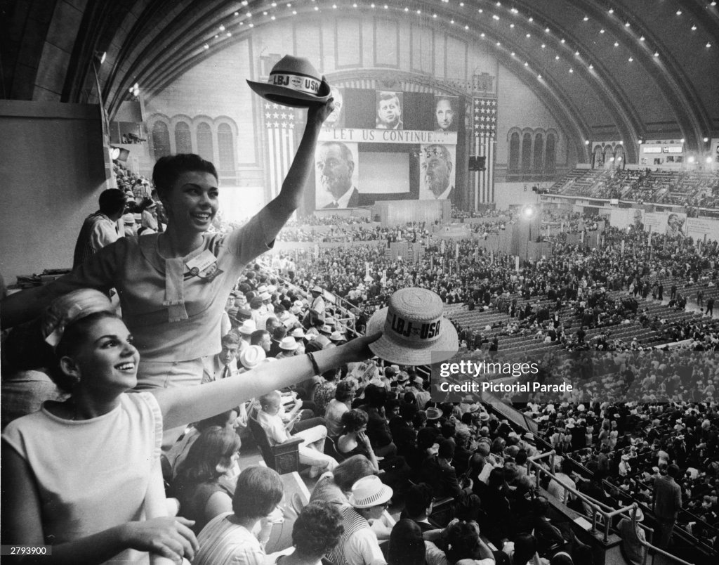 Almost the entire population of the White House has moved from 1600 Pennsylvania Avenue to the Pageant Motel, across the street from Convention Hall, for the Democratic National Convention. Huddled in conference upstairs, splashing in the pool on the roof or traipsing through the tiny, coral‐colored lobby are many of the men and women who surround President Johnson. They include the President’s and Mrs. Johnson’s press secretaries, speech writers, consultants, liaison men with Congress and culture, court jesters, Secret Service men, relatives and friends — several hundred in all.