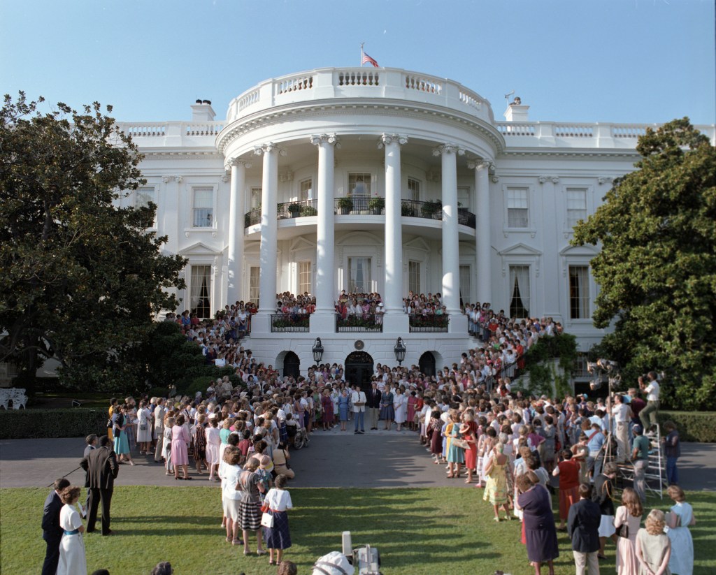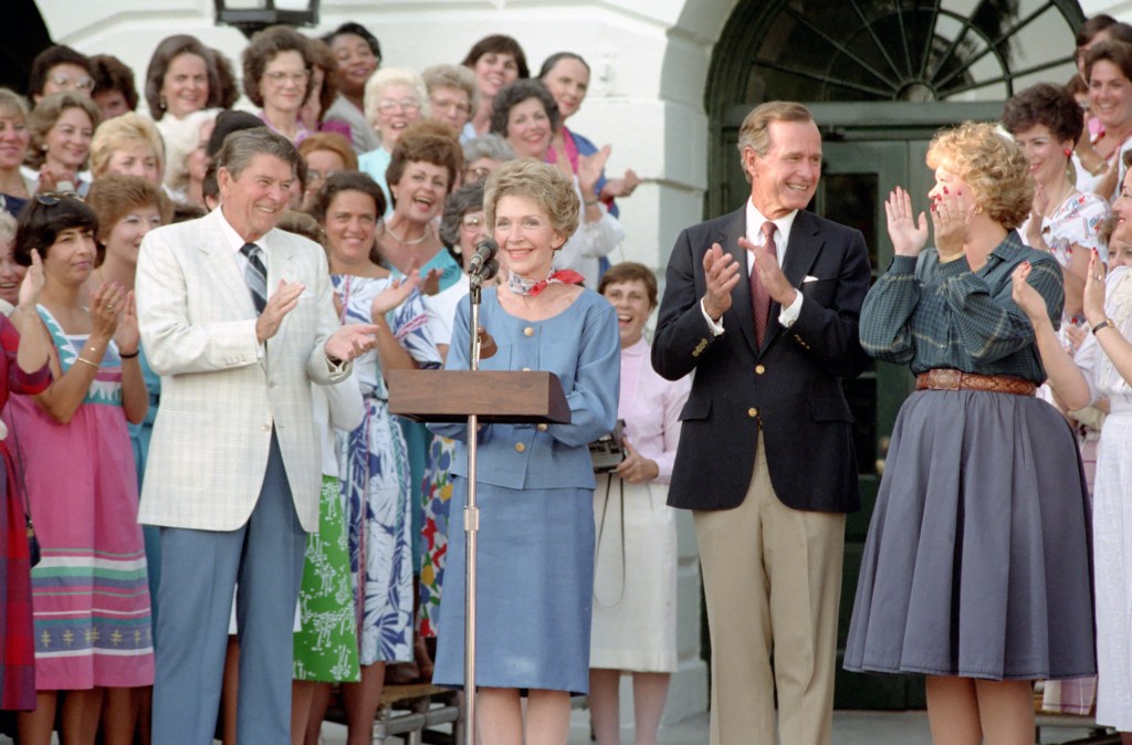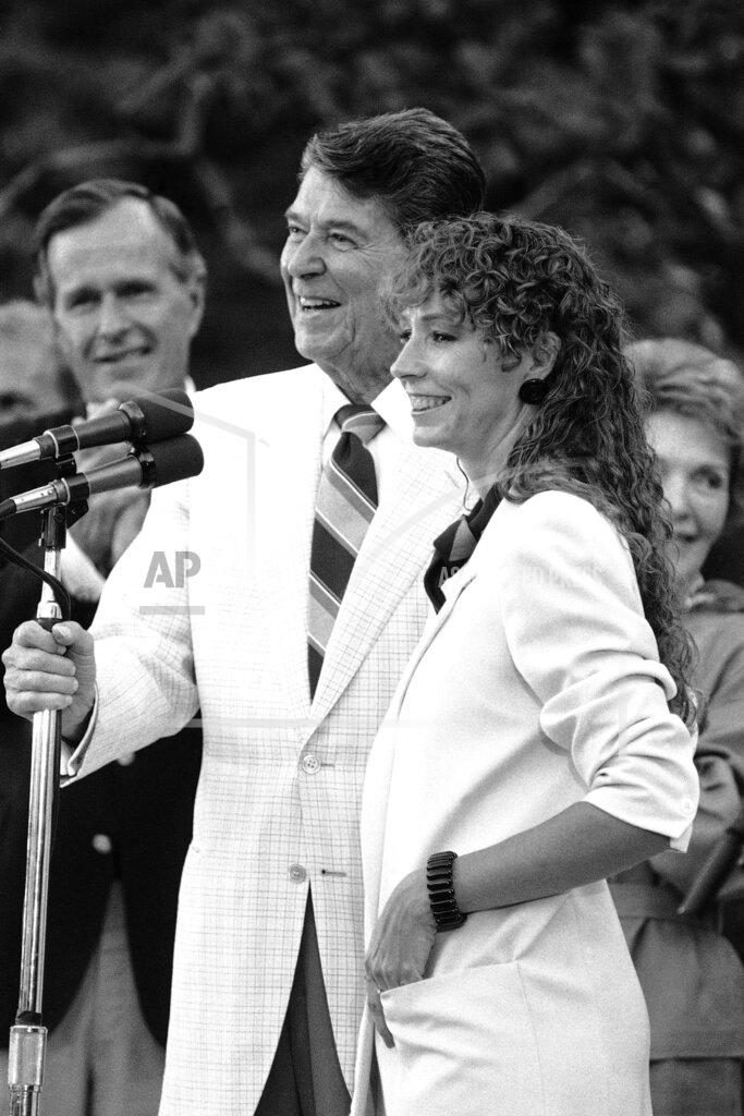 The President and First Lady host a reception and barbecue for women appointees in the administration in honor of Women’s Equality Day, 1984. The birthday of women’s suffrage in the United States was observed at the White House in the Republican and Democratic campaigns, and at many private as well as political gatherings. It was billed as Women’s Equality Day — the 64th anniversary of the ratification of the 19th amendment, which gave women the vote — and it was a banner day for women in an election year in which they are expected to make up a majority of the voters. Juice Newton entertained the White House guests.