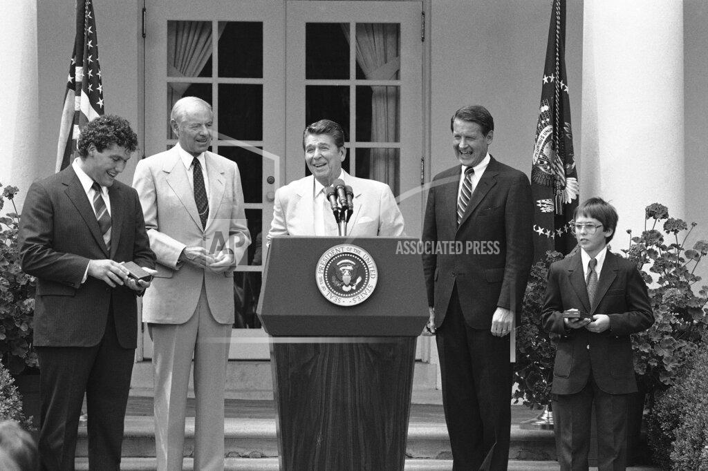 President Reagan participates in a ceremony to present the 1983 Young American Medals for outstanding acts of bravery.