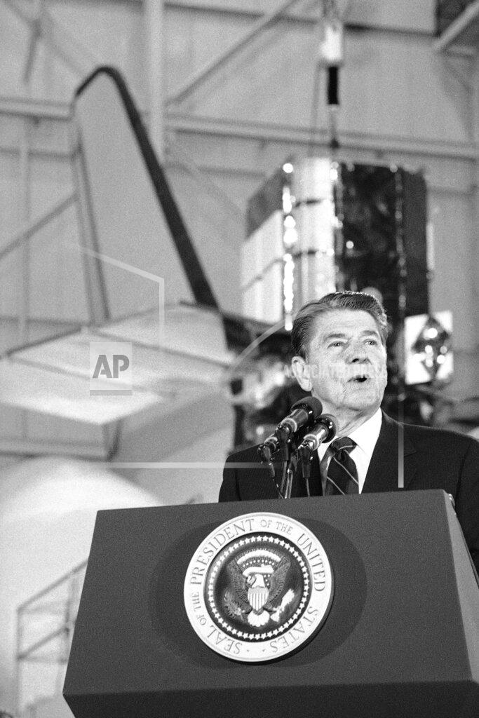 President Reagan tours the Goddard Space Flight Center in Greenbelt, Maryland. President Reagan is presented with a glass-blown model of the Solar Maximum Mission Satellite. President Reagan campaigned gently in the wake of the space shuttle launching today, telling a group of space scientists that he supported “high tech, not high taxes.” Mr. Reagan, on a tour of the Goddard Space Flight Center here where he thanked workers for their role in the space program, spoke optimistically of the country having the power to “create a bounty of new jobs, technologies, and medical breakthroughs surpassing anything we have ever dreamed or imagined.” High technology spurred by capital investment is the key, he emphasized, turning briefly to the tax question that has been an issue in his re-election campaign.