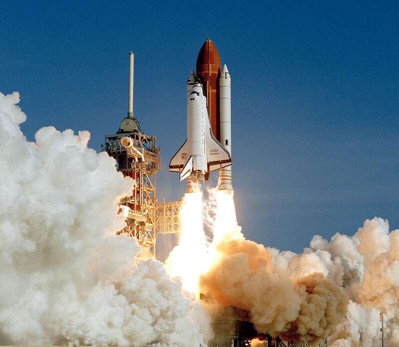 The NASA space shuttle Discovery rocketed into orbit on its maiden flight (STS-41D) after three postponements over two months and successfully deployed the first of three communications satellites in its cargo. The launching of the $1.2 billion space shuttle at 8:42 AM had been delayed nearly 7 minutes by the intrusion of a small private plane in the restricted airspace around the Kennedy Space Center. Commanding the Discovery is Henry W. Hartsfield Jr., who was a pilot on the fourth shuttle mission in 1982. The other crew members, all making their first trips in space, are Commander Michael L. Coats of the Navy, Lieutenant Colonel Richard M. Mullane of the Air Force, Dr. Steven A. Hawley, Dr. Judith A. Resnik and Charles D. Walker. Soon after reaching orbit, Dr. Resnik, an electrical engineer who is the second American woman to travel in space, radioed her first impressions. “The earth looks great,” she remarked.
