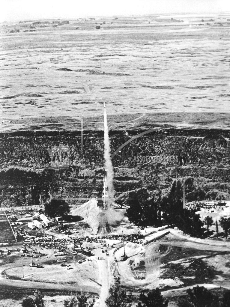 Robert (Evel) Knievel, the motorcycle stuntman, failed but survived in an attempt to rocket 1,600 feet across the Snake River Canyon in Twin Falls, Idaho. He mounted a 13-foot steam rocket in a stunt that attracted thousands of people. The flight aborted, however, almost as soon as the steam exploded from the rocket’s rear nozzle. Although Knievel cleared the canyon, a premature parachute deployment caused the rocket to drift back to the launch side, landing at the bottom of the canyon near the river. The rocket landed on its nose on the rocky bank of the Snake River, and Mr. Knievel was pulled unhurt from the craft several minutes later.