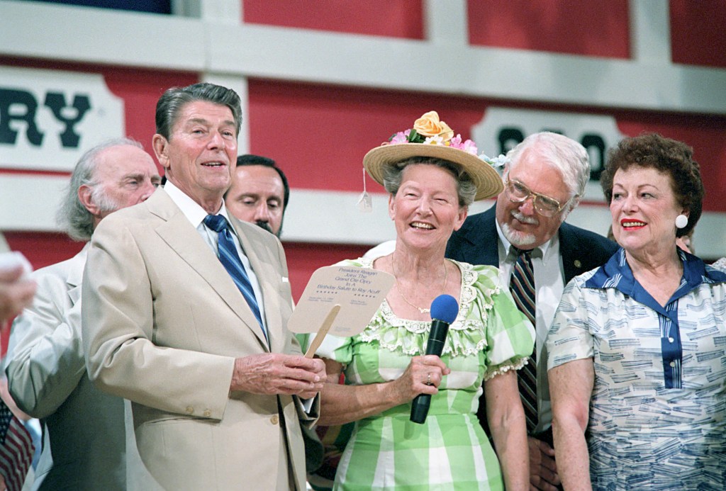 President Reagan meets with Roy Acuff and then heads over to the Grand Ole Opry for Mr. Acuff’s 81st birthday celebration. President Reagan, on stage at the Grand Ole Opry in Nashville, paid homage to Roy Acuff at a celebration of the country singer’s 81st birthday. Mr. Reagan posed a choice between what he termed his “program of progress” and a Democratic version of America “wringing her hands,” divided by envy and determined to “knock opportunity.”