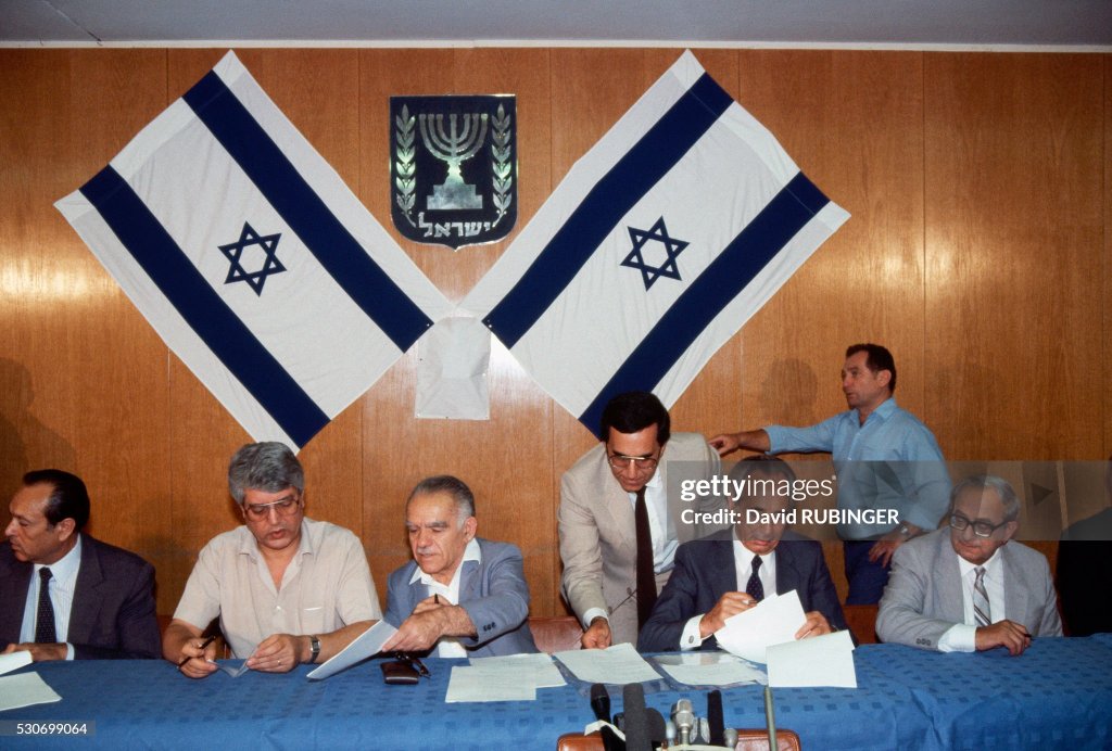 A government of national unity based on power sharing by the two major political groups, the Labor Party and the Likud bloc, was approved by Israel’s Parliament. Shimon Peres then took the oath as Israel’s eighth Prime Minister, succeeding Yitzhak Shamir. The Parliament voted the new Government into office after more than eight hours of debate. The vote was 89 to 18, with 1 abstention. As the debate Thursday proceeded into the night, the 12 other legislators left before the vote was taken. The vote came after seven weeks of political wrangling, culminating in three days of round-the-clock negotiations.