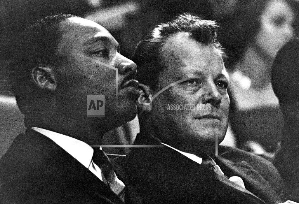 The Rev. Dr. Martin Luther King Jr. heard German church leaders and Christian believers today pledge their support of the civil rights movement in America. Addressing 25,000 West Berliners at a church rally in Waldbuehne Stadium, the Black integration leader said American Negroes were following the call “to be the conscience of the nation.” Bishop Otto Dibelius, the 84year‐old head of the Protestant Church in Berlin, declared that “the whole of Christianity will be at your side in your struggle of nonviolence.” Later Dr. King, who was invited to Berlin by Mayor Willy Brandt to help open the city’s annual Cultural Festival, went across the border wall to preach nonviolence to East Berliners. Several thousand heard his sermon at the Marienkirche in downtown East Berlin.