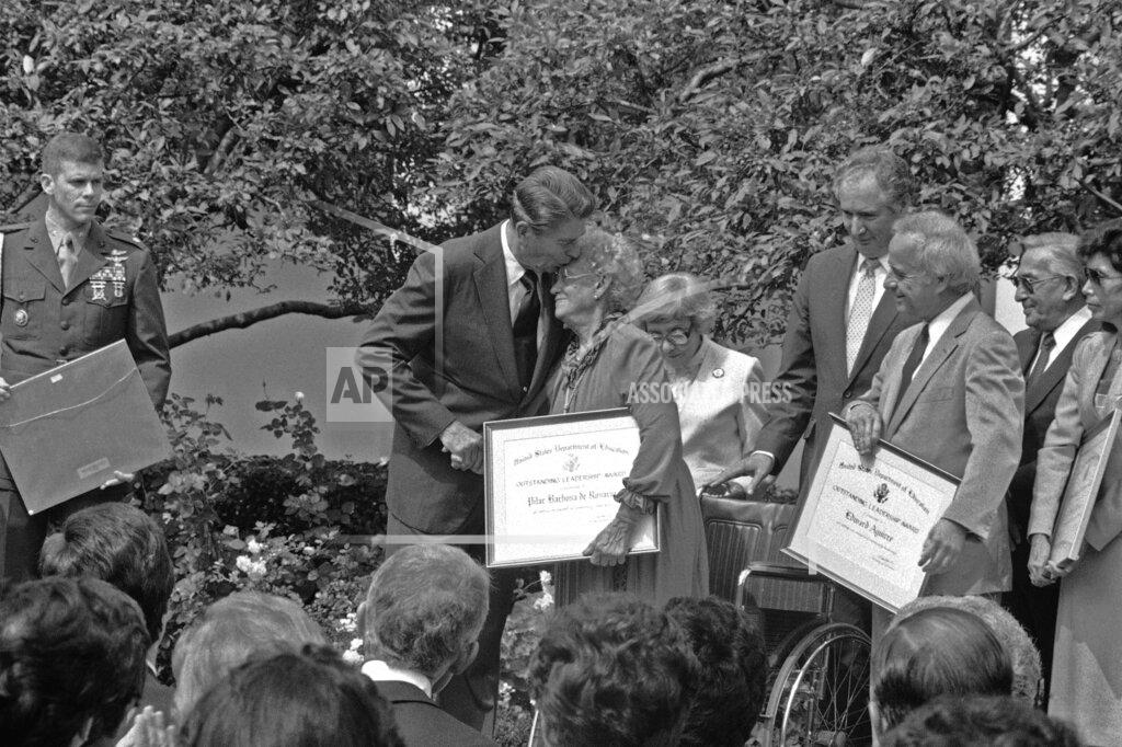 President Reagan participates in a ceremony to recognize Hispanic youth and educators for their outstanding achievements.