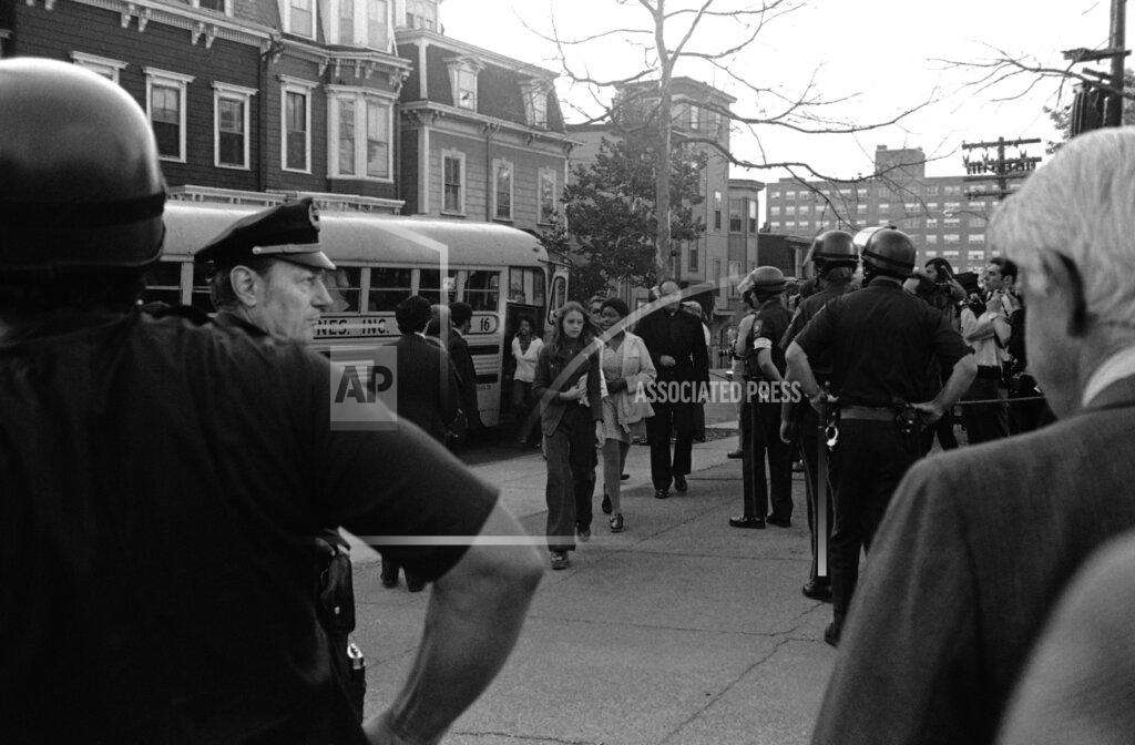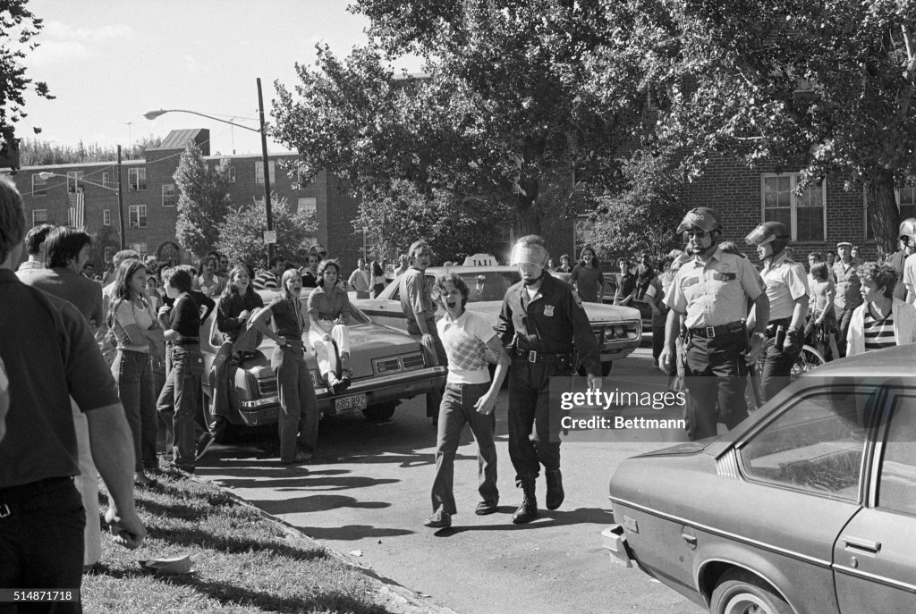 Throughout the morning, policemen mounted on horses and motorcycles blocked and cut through groups of young whites trying to stage protest marches in South Boston, while helmeted squads of the tactical patrol force, wearing blue coveralls and combat boots, sealed off the corners. Shouting “Here we go Southie, here we go,” the high school’s football pep cheer, the crowds marched down the area’s main boulevards until they were blocked, then scattered up side streets and alleys. There were 22 arrests during the day, all but three in South Boston. Two black juveniles were arrested in the Dorchester section for stoning a bus with white students. Those arrested ranged in age from 14 to 38. There were no injuries to students riding school buses, although there were nine injuries in related incidents during the day.