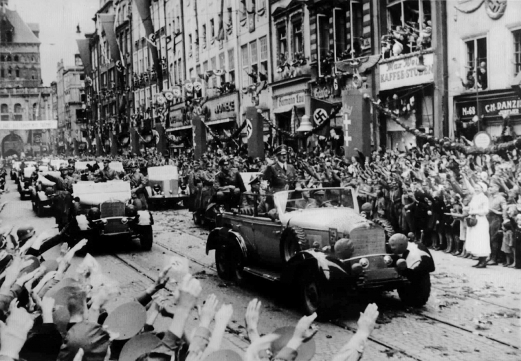 Having crushed Poland and partitioned that country between National Socialist Germany and Bolshevist Russia, Chancellor Adolf Hitler today launched his long expected “peace offensive,” outlining his war aims. He spoke for an hour and a quarter in a festively decorated, brightly illuminated Danzig, which he entered today thunderously acclaimed as a “liberator.” Even the usual blackout has been waived for his visit, although the guns that Danzig’s “liberation” had loosed could still be heard in the region of Gdynia, where a few “death battalions” of Poles were making a last desperate stand.