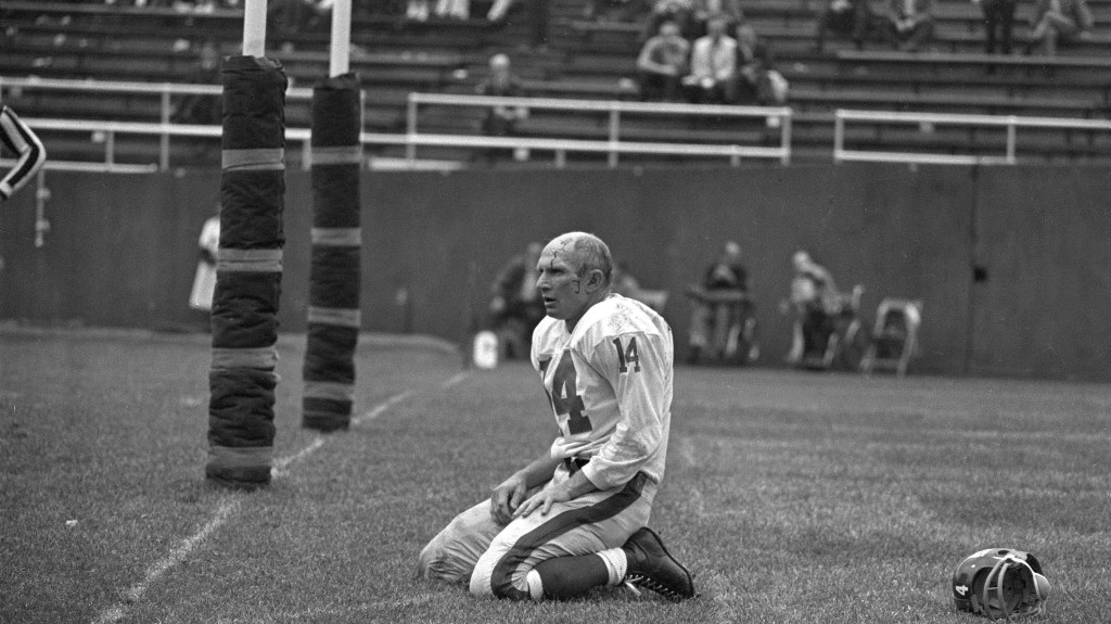 The New York Giants’ longtime habit of making the big plays that win football games has disappeared. In their contest with Pittsburgh today, it was not the Giants but the Steelers who made the big plays, and they won a game that other Giant teams of recent years would have taken easily. The score was 27–24 for the home side as a crowd of 35,053 looked on in Pitt Stadium. The Giants lost more than just a game. They also lost their No. 1 player, Y. A. Tittle, who went down under a vicious tackle by John Baker, a defensive end, near the end of the second period. Tittle’s face was white and etched with pain when he got up and the Giants quickly removed him to their dressing room. He did not reappear. Tittle, hit when throwing a screen pass that was intercepted for a Steeler touchdown, took a hard blow to the rib cage. He flew back to New York with the team and was immediately taken to St. Elizabeth’s Hospital for X‐rays.