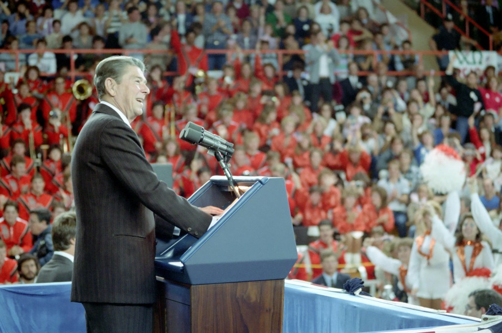 President Reagan addresses about 4,500 students of Bowling Green State University on foreign policy issues.
