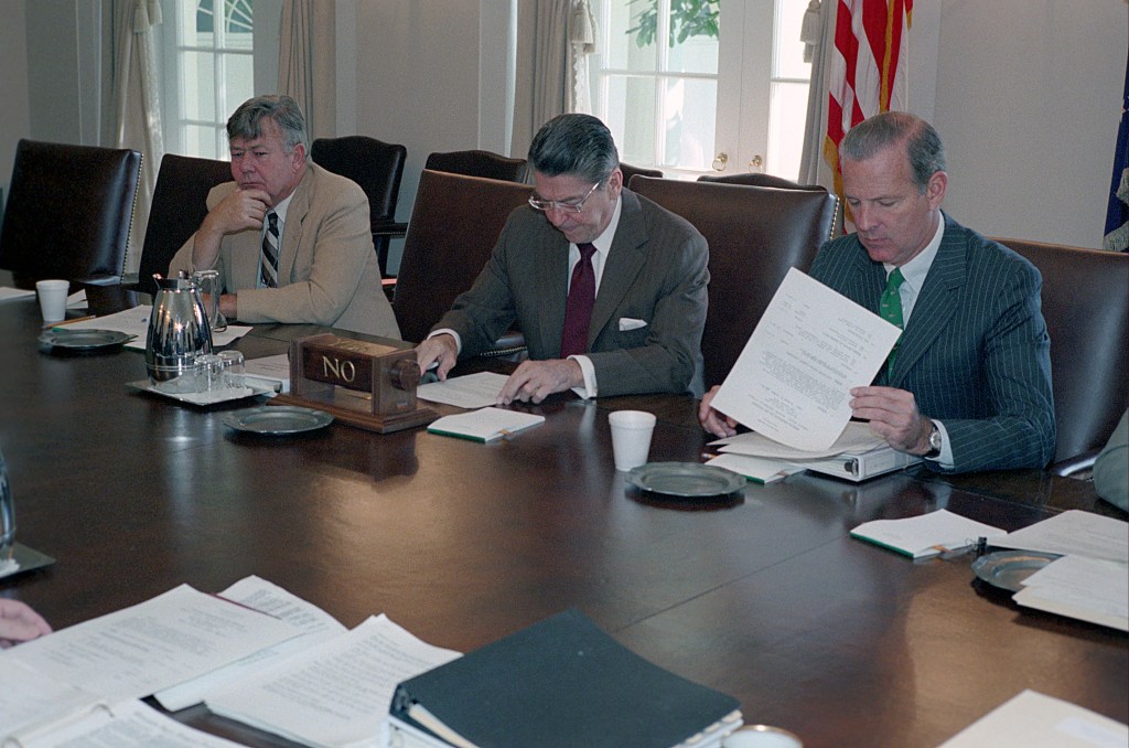 President Reagan and Vice President Bush participate in a briefing for a group of incumbent Republican Members of Congress and Congressional candidates.