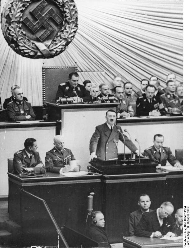 Hitler addressed a special session of the Reichstag. After speaking at great length about the victory over Poland he then proposed an international security conference, hinting at desire for an armistice by saying that such a conference would be impossible “while cannons are thundering.” Hitler declares that up to now he has only corrected the unjust Versailles Treaty and that he has no war aims against Britain and France. He blames warmongers like Churchill for the present state of affairs and Hitler calls for a new European conference to end the war, and to settle Germany’s differences with England and France. Hitler declares to the Reichstag that Germany has “no further claims against France,” and adds, “Nowhere have I ever acted against British interests.” Both Britain and France will refuse.