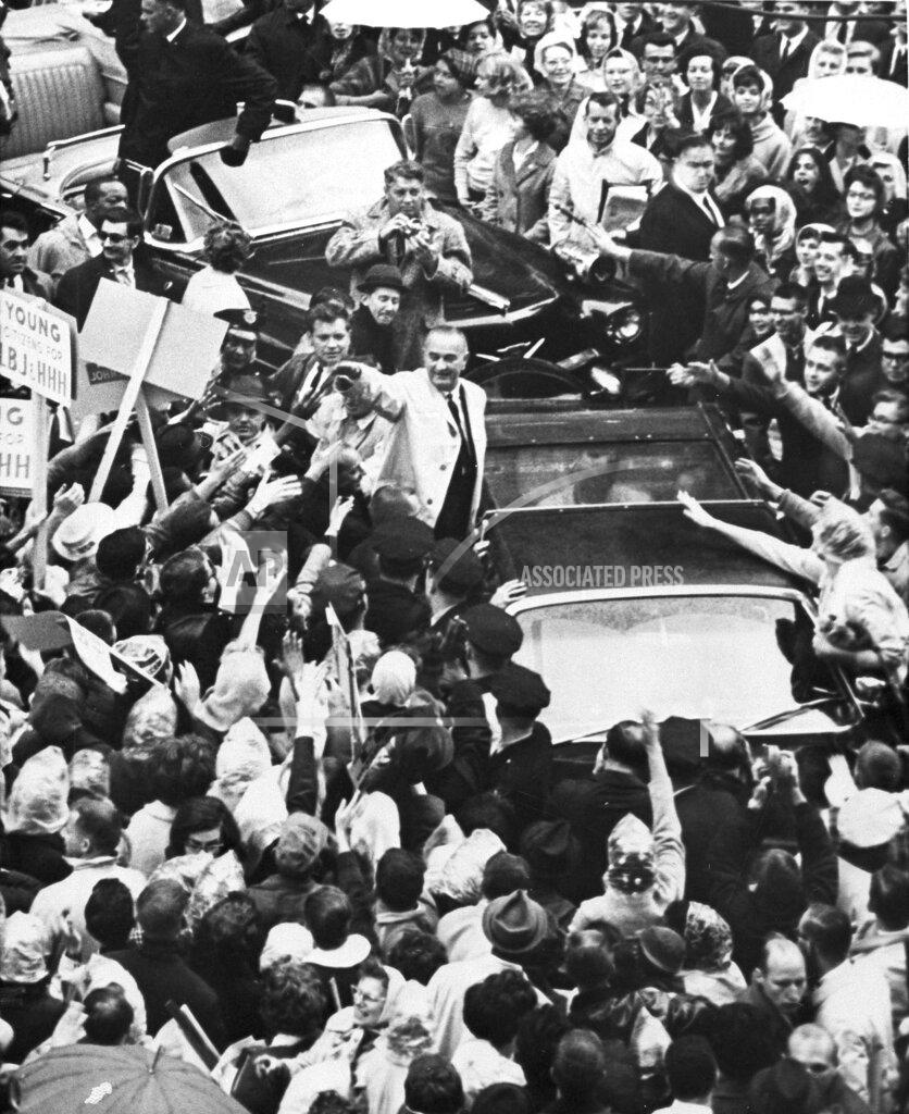 President Johnson carried into Indiana and Ohio today his campaign to achieve what he hopes will be “the greatest Democratic landslide in American history.” In Indiana he was greeted, as he was yesterday in Iowa and Illinois, by large and enthusiastic crowds. A noon‐hour crowd estimated by police officials at 40,000 filled much of the Circle in Indianapolis around the Soldiers and Sailors Monument. Many more thousands spilled down the streets leading out of the Circle opposite the speaker’s stand. When the President set out for lunch at the Indianapolis Athletic Club, the milling thousands pressed in on his car and brought it to a stop again and again.