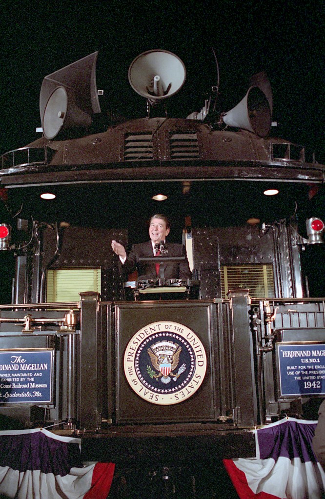President Reagan participates in a whistle-stop tour of about 250 miles through Ohio aboard U.S. Car One, a custom built Pullman railroad car. President Reagan, imitating Harry S. Truman, took his re-election caravan on the late President’s 1948 whistle-stop train route and drew cheers from huge crowds in the farmlands and towns of western Ohio as he assailed Walter F. Mondale and asked Democrats to join his cause. In a display that Democrats charged amounted to political grand larceny, Mr. Reagan addressed crowds from the back of the Pullman car that was used by the Democratic President and repeatedly invoked his name.