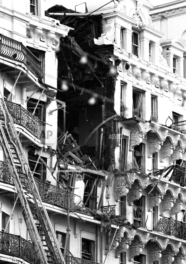 The I.R.A. took responsibility for placing a bomb in the seafront Grand Hotel, in Brighton, that killed at least two people, injured at least 34 and came within minutes of killing or maiming Prime Minister Margaret Thatcher. Mrs. Thatcher, who escaped without injury, had just left the bathroom of her suite when the explosion ripped through the Brighton Hotel. Her husband, Denis, later reported that the bathroom was “mangled.” The I.R.A. bombing of the hotel in Brighton was aimed at derailing new efforts to achieve a settlement in Northern Ireland, according to British and Irish politicians. Prime Minister Thatcher is scheduled to discuss the Northern Ireland situation next month with Garret FitzGerald, the Irish Prime Minister.
