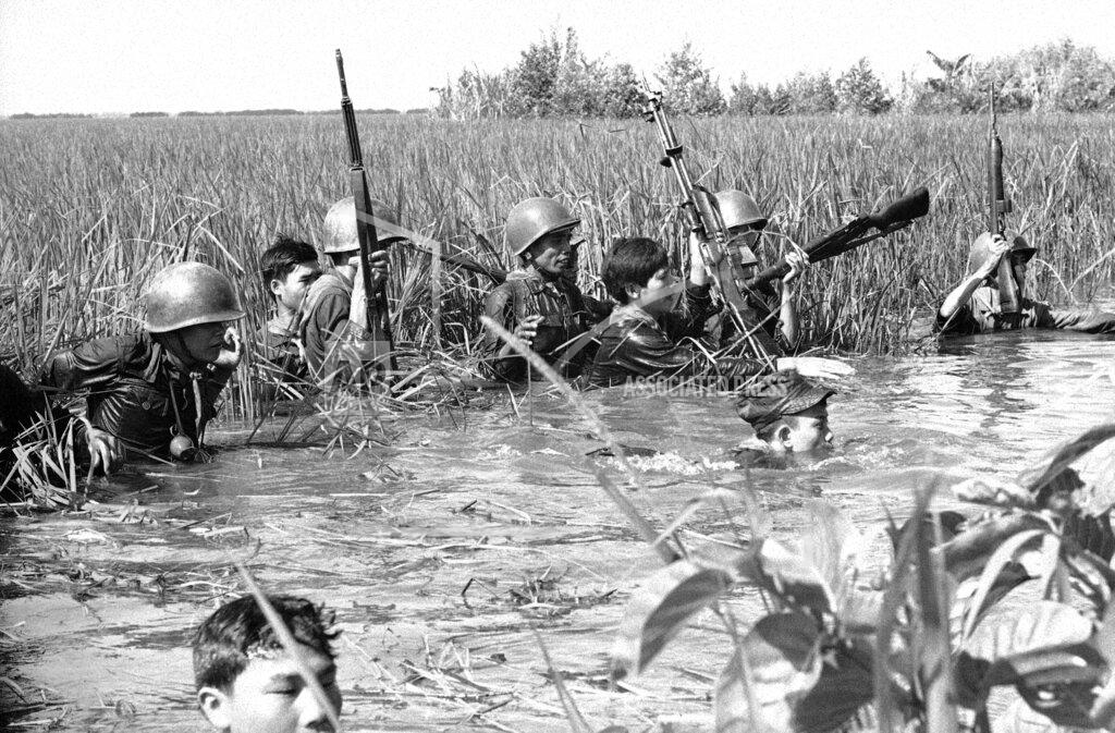 Government forces hit ground only 30 minutes after 300 Việt Cộng members were spotted in the area. While helicopters provided air support, troops jumped out to find themselves in ncar‐neck‐deep water. Reeds were well over their heads. Although there was sporadic shooting, neither force saw the other. The helicopters were unable to pinpoint enemy units, which escaped. The delta region is only dry about four months out of a year. Helicopter companies normally consist of 35 armed and troop‐carrying helicopters and 250 men.
