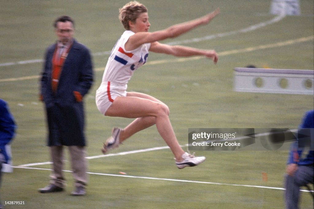 Mary Rand of Great Britain leaps a world record 6.76m to win the women’s long jump gold medal at the Tokyo Olympics.