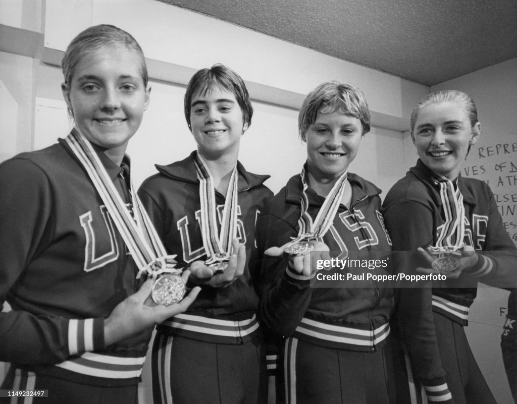 US women’s 4 x 100m freestyle relay team of Sharon Stouder, Donna de Varona, Lillian Watson & Kathy Ellis swims world record 4:03.8 to beat Australia by 3.1s and win the gold medal at the Tokyo Olympics.