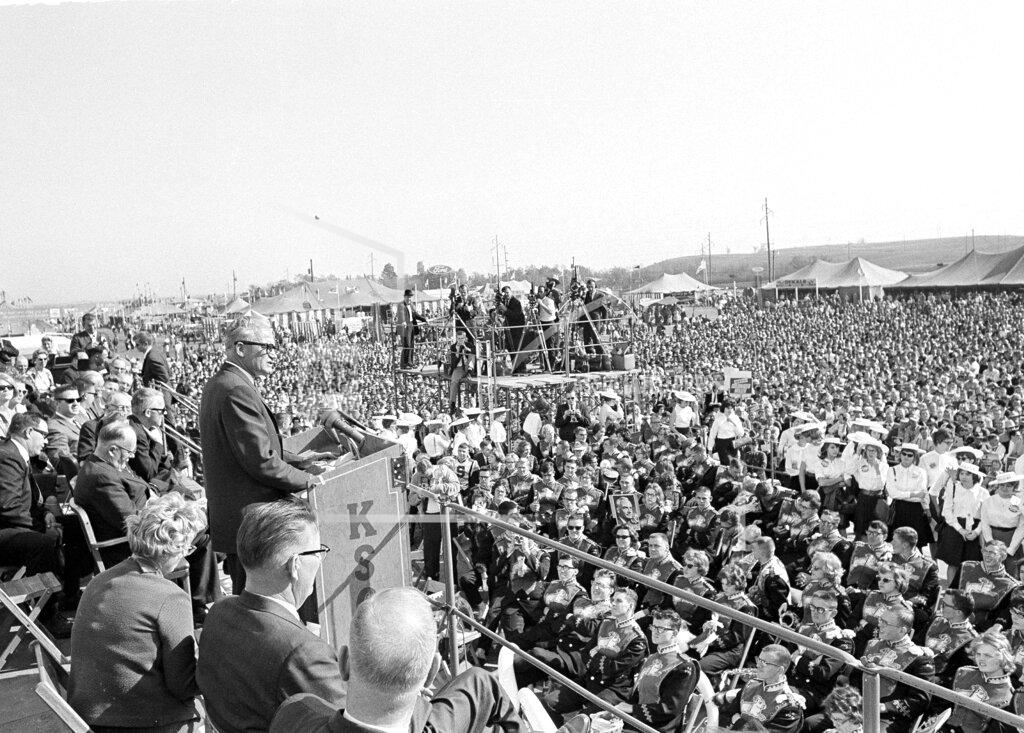 He went on to say: “I propose to use this campaign for the broad purposes that a campaign is meant for, a campaign to educate — educate the American people and the candidates themselves. “A campaign can tear open new wounds and it can pour salt on fresh wounds. It can divide America instead of uniting it.” The signs in the crowd were printed in black on white cards. One said: “What About Walter Jenkins.” Another read: “Corruption Patrol,” and linked the names of Robert G. Baker, Billie Sol Estes, and Mr. Jenkins.