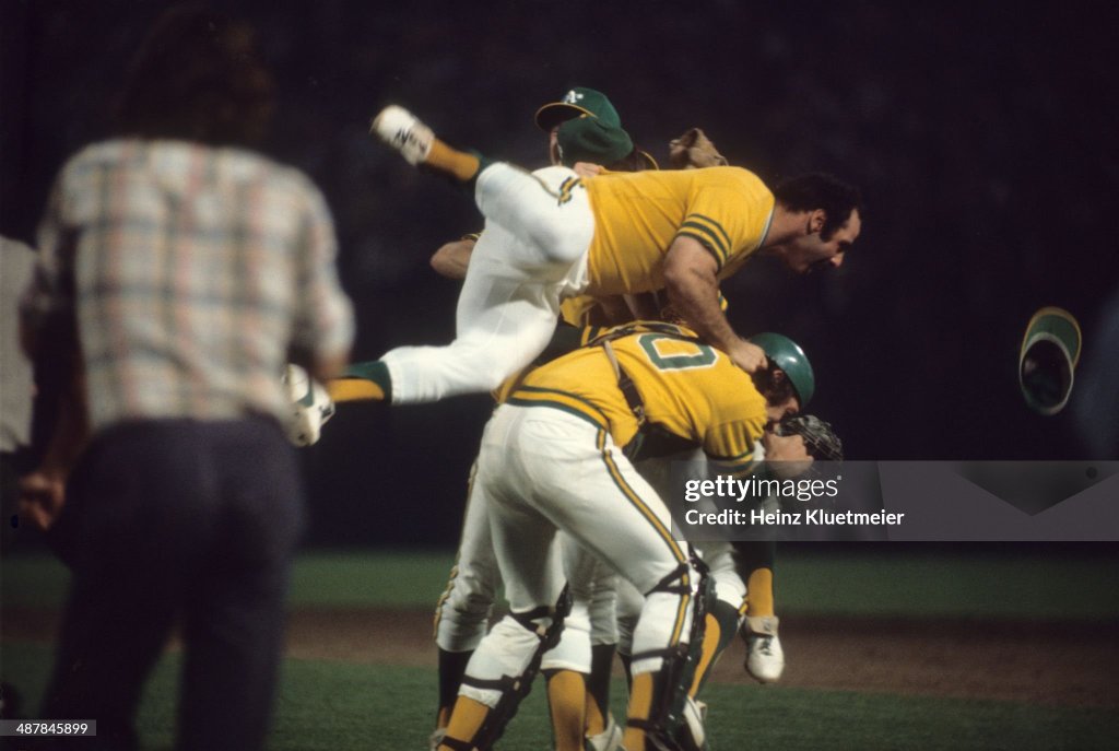 The Oakland A’s won the 1974 World Series, four games to one, over the Los Angeles Dodgers, defeating the Dodgers 3 to 2 in Game 5. The A’s staked Vida Blue to a 2–0 lead with single runs in the first and second innings on a sacrifice fly by Sal Bando and a homer by Ray Fosse. The Dodgers tied it in the sixth with two runs on a sacrifice fly by Jimmy Wynn and an RBI single by Steve Garvey. Joe Rudi got what would turn out to be the game-winning RBI when he tagged Dodger ace reliever Mike Marshall with a homer in the bottom of the seventh. The half-inning was delayed when Bill Buckner complained of A’s fans throwing debris onto the field. Marshall, who always pitched in short sleeves, disdained his allowance of eight warm up pitches after coming in from the bullpen even after the delay. Rudi then proceeded to deposit Marshall’s first pitch over the left field wall. In the Dodgers half of the eighth, Buckner led off with a base hit to center that got past center fielder Bill North. Buckner had an easy double, but tried to stretch it to a triple and Reggie Jackson, backing up North, fired a perfect throw to Dick Green, who relayed to Sal Bando at third to nail Buckner and squelch the last Dodger threat. Rollie Fingers got his second save and was named Series MVP.