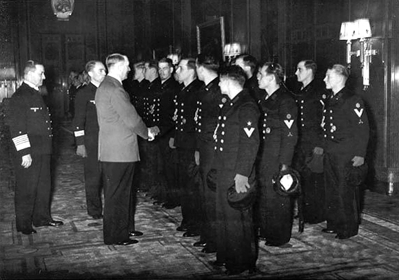 The crew of the U-47 was brought to the Reich Chancellory in Berlin where they all received the Iron Cross 2nd Class and the personal congratulations of Hitler. Captain Günther Prien was awarded the Knight’s Cross. Prien and the crew of the German submarine which is reported to have sunk the HMS Royal Oak at Scapa Flow flew to Berlin today in Chancellor Hitler’s private four-motored Condor airplane. They received a tumultuous reception from the population and were received by Herr Hitler in the new chancellory this noon.