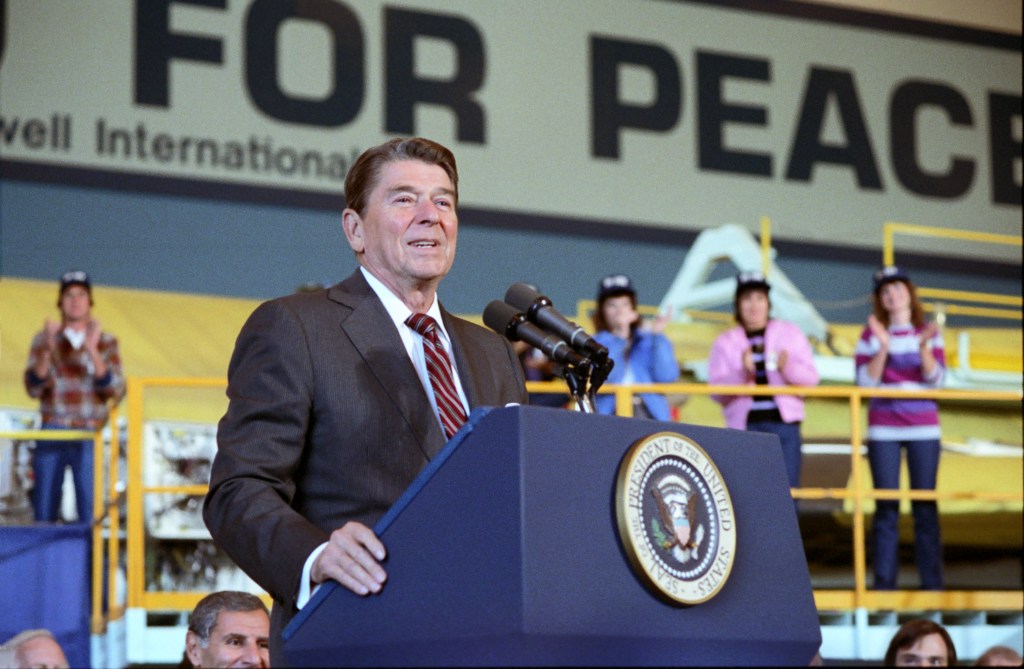 President Reagan spends most of the day campaigning in Southern California and Oregon. President Reagan, flush from what he considered a successful debate performance against Walter F. Mondale, stalked his rival from the shadow of the B-1 bomber today, saying the Democratic nominee had a “frightening” national defense record of “hostility to a strong, secure America.” Mr. Reagan visited the B-1 bomber factory in Palmdale, Calif., and underlined Mr. Mondale’s opposition to the warplane, contending, “Mr. Mondale made a career out of weakening America’s armed forces.” In their debate Sunday night, the Democratic challenger asked Mr. Reagan to give him credit for with supporting a strong national defense. Mr. Reagan made no such concession as he stepped up his campaign in the final two weeks before the election.