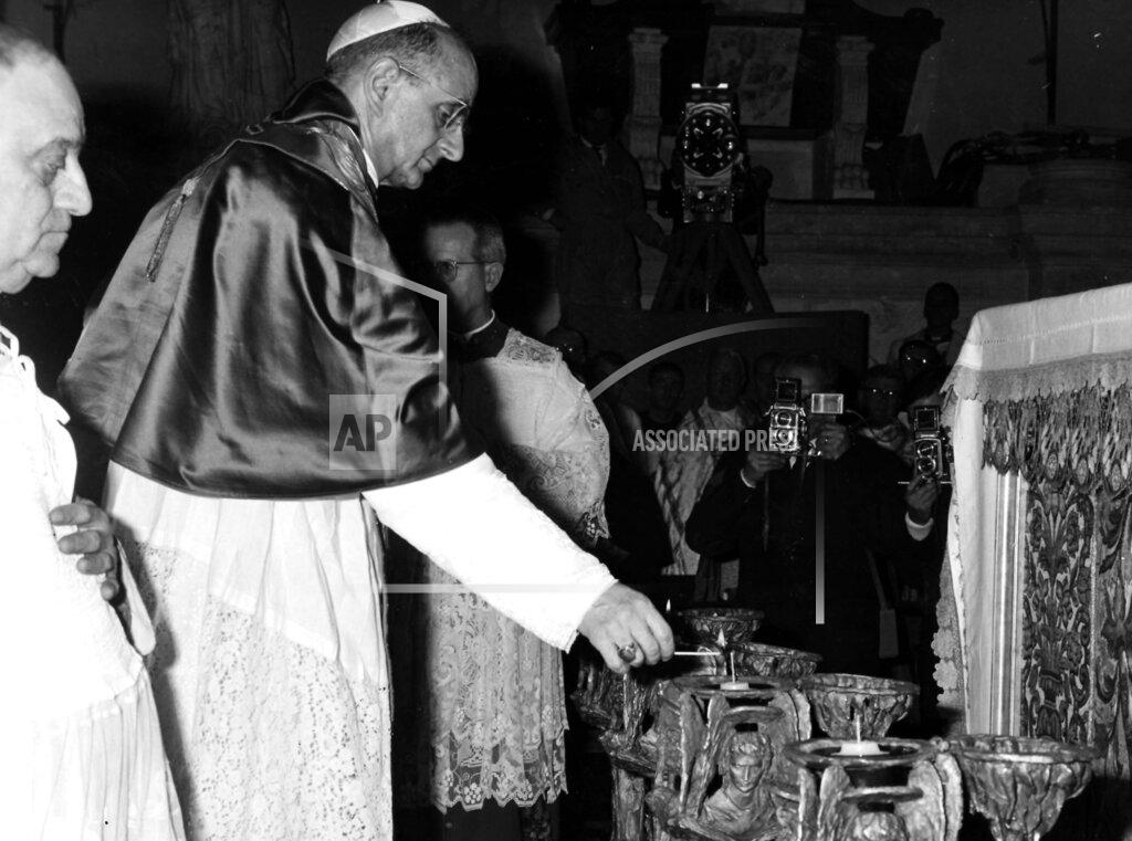 Pope Paul VI rededicated to peace and European unity today the sixth‐century Benedictine abbey of Monte Cassino, destroyed during World War II and later reconstructed on its hilltop site. The Pope also formally declared the abbey’s founder, St. Benedict of Nursia, the patron saint of Europe. Benedict set afoot the great movement that spread monasteries throughout Europe. It was in those monasteries that monks kept alive the traditions of classical learning while the rest of the Roman Empire sank into the barbarism of the Dark Ages. “May this eminent saint thus fulfill our wishes,” the Pope said, “and, as he once succeeded in overcoming darkness and spreading the gift of peace with the light of Christian civilization, may he now preside over all European life and. with his intercession, develop and increase it ever more.” Driving rain and thunderstorms forced the Pope to abandon his plan to come here from the Vatican by helicopter. Instead, he left Rome in his special Mercedes‐Benz limousine, acompanied by members of the papal court and half a dozen cardinals.