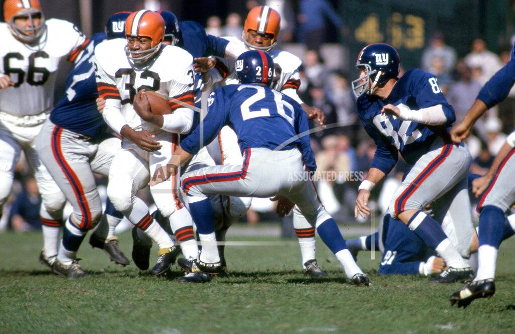 The New York Giants played their best football of this unfortunate season, but still lost, 42–20, to the Cleveland Browns. The Giants, who had won five of their last six games here going back to 1958, entered the fourth quarter down by only a point, 14–13. Then came the disasters. Within the span of 4½ minutes, the Browns scored three touchdowns as a result of two fumble recoveries and an interception. First, Dick Lynch intercepted a pass by Frank Ryan, Cleveland’s unimpressive quarterback, on the New York 3‐yard line as the third period ended. On third down, Dick James swept left end, but fumbled the ball backward as he attempted to leap over a Cleveland tackler. Paul Wiggin, the Browns’ defensive end, scooped up the ball on the 2‐yard line and rolled his large body into the end zone for the score. Next, Jim Houston, a Cleveland linebacker, intercepted a pass by Y. A. Tittle that had bounced off the shoulder of Steve Thurlow a rookie Giant halfback. lt was Tittle’s third interception of the game, but more of a bad break than an error. Houston returned 44 yards to the Giant 31 and then Jimmy Brown, the Cleveland star, made his only big offensive gesture of the day, running 22 yards to the 9. From there, Ryan passed to Gary Collins for a touchdown, putting Cleveland ahead, 28–13. Then it was Clarence Childs’s turn to fumble, and he did on the ensuing kickoff return at the New York 23. Charlie Scales, who has the effortless job of being Jim Brown’s understudy, picked up this fumble and raced 32 yards for another score.