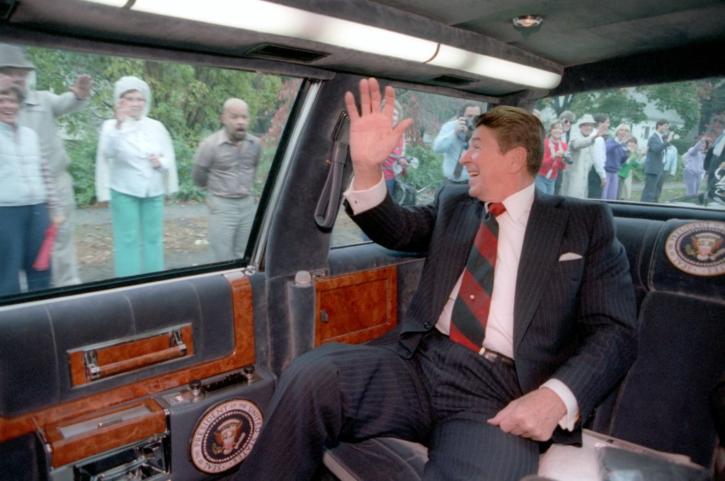 President Reagan enjoys lunch at the residence of Rabbi Friedman. The President, in Woodmere, Long Island, New York, courted Jewish voters by visiting Temple Hillel and dined at the home of Rabbi Morris Friedman and his family. The visit deeply divided the congregation and the community, and one neighbor protested by practicing drum rolls.