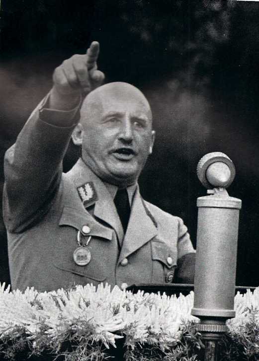 Julius Streicher speaks to a mass meeting in Nuremberg. Streicher encourages people to have faith in Hitler and rejoice in the fact that Jews no longer ruled Germany. Streicher is most known as the leading anti-Semite of the Third Reich (after Hitler, of course). He was also Gauleiter of Franconia. This may be his last major public speech, since he was in a variety of difficulties by this time, and was soon exiled to his estate outside Nuremberg.