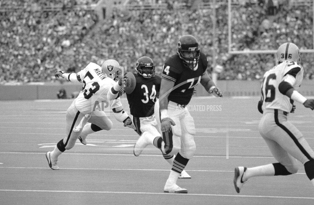 Walter Payton rushed for 111 yards and two first-half touchdowns and the Chicago defense forced five turnovers and recorded nine sacks today in sparking the Bears (7–3) to a 17–6 victory over the Los Angeles Raiders (7–3). Payton, carrying 27 times and exceeding the 100-yard mark for the 61st time in his career, scored on an 18- yard run in the first quarter and added an 8-yard touchdown run in the second quarter. The defeat marked the first time since the end of the 1981 season that the Raiders have lost two games in a row. The Raider quarterbacks Marc Wilson and David Humm were injured in the game and Los Angeles could manage only two field goals by Chris Bahr. He kicked a 44-yarder in the second quarter and a 40-yarder in the third quarter. Wilson started the game but had to leave in the first half. He returned in the second quarter when Humm went out with an injured knee. Jim McMahon, the Bears’ quarterback, left early in the third quarter with a kidney injury and was hospitalized. Chicago’s defense, ranked first in the NFL, recorded nine sacks for losses of 58 yards and forced three fumbles and two interceptions. Chicago had 11 sacks in its victory over Minnesota last week. One of the interceptions in the game today game led to Payton’s second touchdown, which gave the Bears a 14–0 lead.