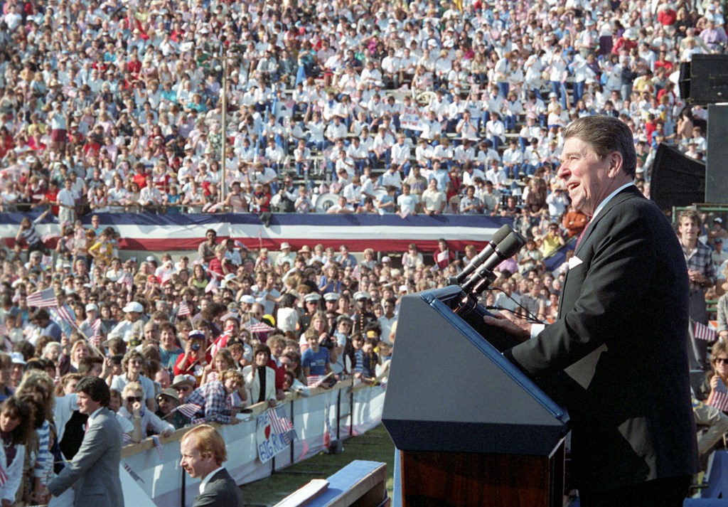 President Reagan finished his plea for re-election with a fond return to home-state voters and an appeal to the nation to “go forward with an America of momentum.” President Reagan views a picture and plaque in the newly named Ronald Reagan Cabinet Room at the California Capitol building. President Reagan addresses a crowd on the west steps of the California Capitol, where the President was sworn in twice as Governor of California.