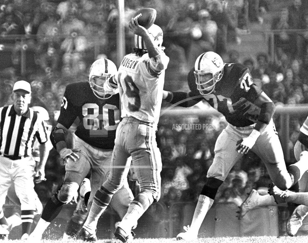 The Oakland Raiders thumped the Detroit Lions, 35–13, and rolled to their eighth straight victory with Mary Hubbard running for two touchdowns and Ken Stabler passing for two. The Oakland quarterback connected on 20 of 24 pass attempts for 228 yards as the Raiders remained 3½ games ahead of Denver in the American Conference’s Western Telvision. Stabler’s scoring passes went 36 and 15 yards to Cliff Branch, who has now caught eight touchdown aerials. Detroit, which won its last four games, scored on a 1‐yard run by Altie Taylor and field goals by Errol Mann of 32 and 35 yards.