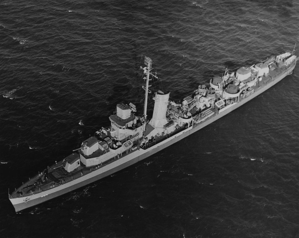 Returning to Saipan the same day, Rhind accompanied landing craft to Marcus Island. Then, on the 16th, headed north for Iwo Jima, whence she patrolled on air/sea rescue station until 2 November. She returned to Saipan on the 4th and operated in the Marianas until mid-December when she got underway for the United States. Arriving at San Diego 30 December, she was stripped and returned to Pearl Harbor and prepared for experimental testing. On 15 May she joined Joint Task Force 1 for operation “Crossroads,” the atomic test series scheduled to be detonated at Bikini in July. Surviving the tests on 1 and 25 July, but highly contaminated, Rhind was decommissioned 26 August 1946 and moved to Kwajalein where, after radiological clearance had been given and further examinations had been made, she was sunk, 22 March 1948. Her name was struck from the Navy list 5 April 1948.