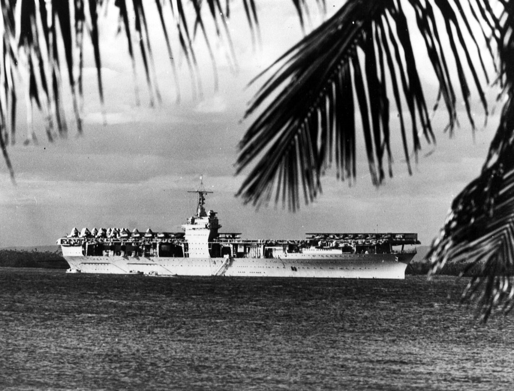 Between January and March 1945 Rhind continued coastal and Caribbean escort duty. Then after another run to Britain 23 March to 18 April, she prepared for transfer to the Pacific Theater. Sailing 5 May, she arrived at Pearl Harbor on the 30th; and, after exercises there, steamed westward in the screen of carriers Lexington (CV-16), Hancock (CV-19), and Cowpens (CVL-25). On 20 June, the carriers launched strikes against Wake. Then, minus Cowpens and an escort, the force continued on to Leyte, arriving 26 June. From Leyte, Rhind steamed to Ulithi, whence she escorted cargo and troop ships to Okinawa and conducted ASW patrols in the Carolines. Shifted to Saipan in August, she escorted another convoy to Okinawa after the cessation of hostilities, then on 2 September steamed to Pagan Island where Commodore Vernon F. Grant accepted the surrender of the Japanese garrisoned there.