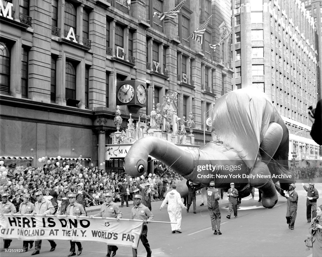 Gusts batted the big balloons from one side of the New York street to another, and the jutting finger of a lamppost finally punctured Dino the Dinosaur. This took the merriment out of Dino, but not out of Macy’s Thanksgiving Day parade, which yesterday went down Broadway for the 38th time. The parade was two and a half hours long. It had 10 marching bands, 100 or more clowns and 20 colorful floats that carryied pretty girls, film stars, a puppet show, TV entertainers, a steel band, a jazz band and part of the Metropolitan Opera ballet company. But most of all the parade was the six enormous balloons, which doze limply in a warehouse in Akron, Ohio, month after month dreaming of this one glorious day each year for a balloon.