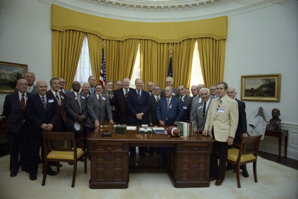 The President and Mrs. Ford celebrated their first Thanksgiving in the White House with a reunion of the president’s Grand Rapids (Michigan) high school football teammates.