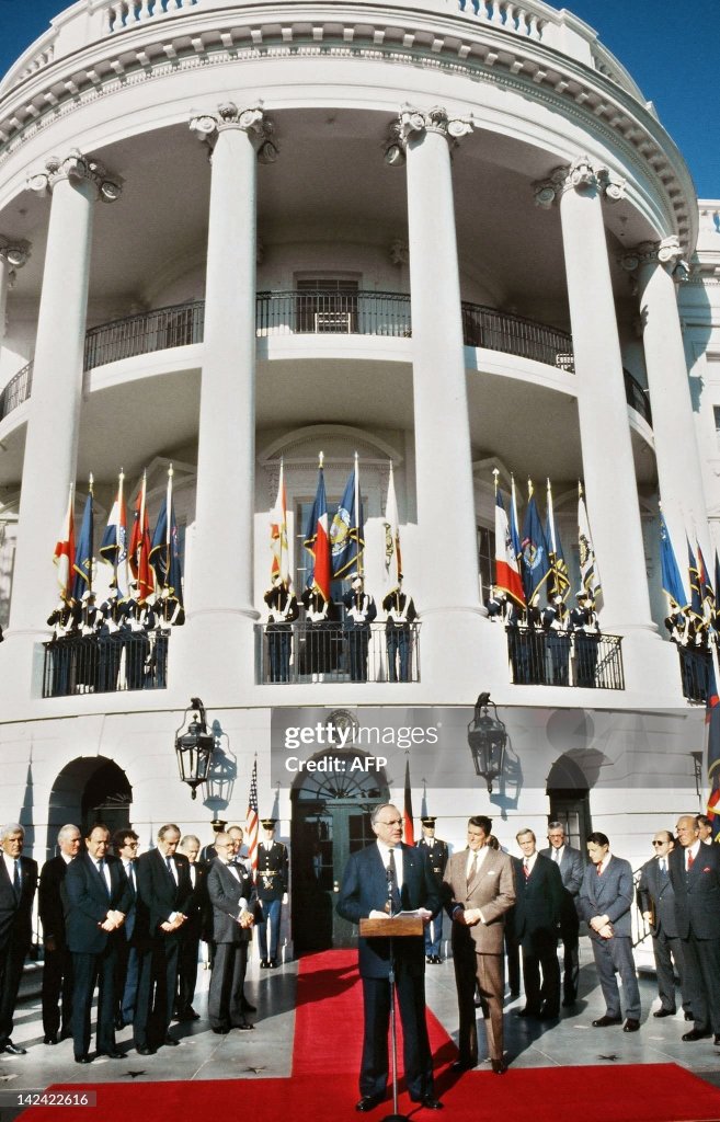 President Reagan welcomes the Chancellor of the Federal Republic of Germany, Helmut Kohl. President Reagan and Chancellor Helmut Kohl of West Germany called today for a new effort by the Atlantic alliance to strengthen conventional forces in Western Europe to reduce the risk or need of nuclear weapons. At the same time, both leaders, in a joint statement, said they would give priority to the search for nuclear arms- control agreements with Moscow. In the first high-level meeting with an allied leader since Mr. Reagan’s re- election this month, the United States also pledged to engage in close consultations with Bonn and other allies before and after Secretary of State George P. Shultz’s meeting with Foreign Minister Andrei A. Gromyko of the Soviet Union next January in Geneva. These talks, the statement said, would “open a new phase of their arms control dialogue.”