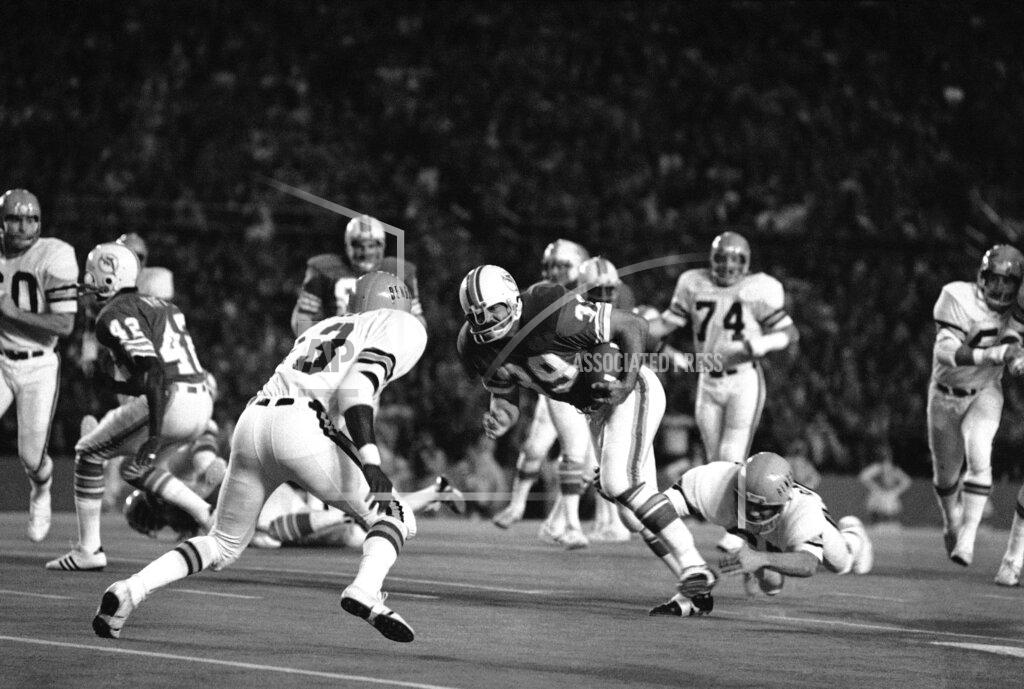 The game was important, so the Miami Dolphins, accustomed to success in such quantity that they need challenges to start the adrenalin moving, responded. They trounced the Cincinnati Bengals, 24–3, tonight in the Orange Bowl for their ninth victory in 12 games and remained tied with the Buffalo Bills for first place in the East Division of the American Conference. The Dolphins were methodical on offense and ‐almost perfect on defense. Bob Griese completed 11 of 13 pass attempts, two for touchdowns, and Larry Csonka smashed ahead for 123 yards rushing. All that the Bengals could achieve was one 29‐yard field goal by Horst Muhlmann, set up by a Miami fumble on the Dolphin 19‐yard line. Cincinnati lost for the fifth time against seven triumphs and its chances for a spot in the league playoffs were diminished but not extinguished. The decision in favor of Miami eliminated two A.F.C. teams from playoff contention, the Denver Broncos and the Houston Oilers. The Dolphins’ remaining opponents are Baltimore and New England. Should they conclude the season in a tie with Buffalo they would be awarded first place in the division because they beat the Bills twice. For the Bengals to reach the playoffs they are going to have to beat Detroit and Pittsburgh in their last two games. The Bengals gained only 162 yards and fumbled five times, losing the ball three times. Meanwhile, Miami gobbled up 310 yards, 196 on the ground, and as far as the defensive players were concerned, they had a shutout, almost.