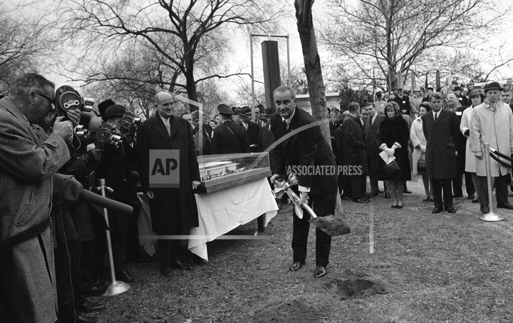 President Johnson broke ground with a gold‐plated spade today for a national cultural center that will keep alive the memory of President Kennedy and fulfill one of his dreams. Gathered on the banks of the Potomac at the ceremony for the John F. Kennedy Center for the Performing Arts were witnesses from what Mr. Johnson called “the worlds of poetry and power.” Sir John Gielgud read in his famous, mellifluous voice from Shakespeare’s “Henry V.” Jason Robards Jr., who had forgotten his notes on the plane that brought him to Washington, quoted President Kennedy from memory on artists and the arts. Senator‐elect Robert F Kennedy told of his brother’s belief “that America is judged as every civilization is judged — in large measure — by the quality of its artistic achievement.”