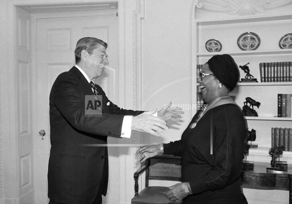 President Reagan receives the first 1984 Christmas Seals from Ms. Pearl Bailey of the American Lung Association.