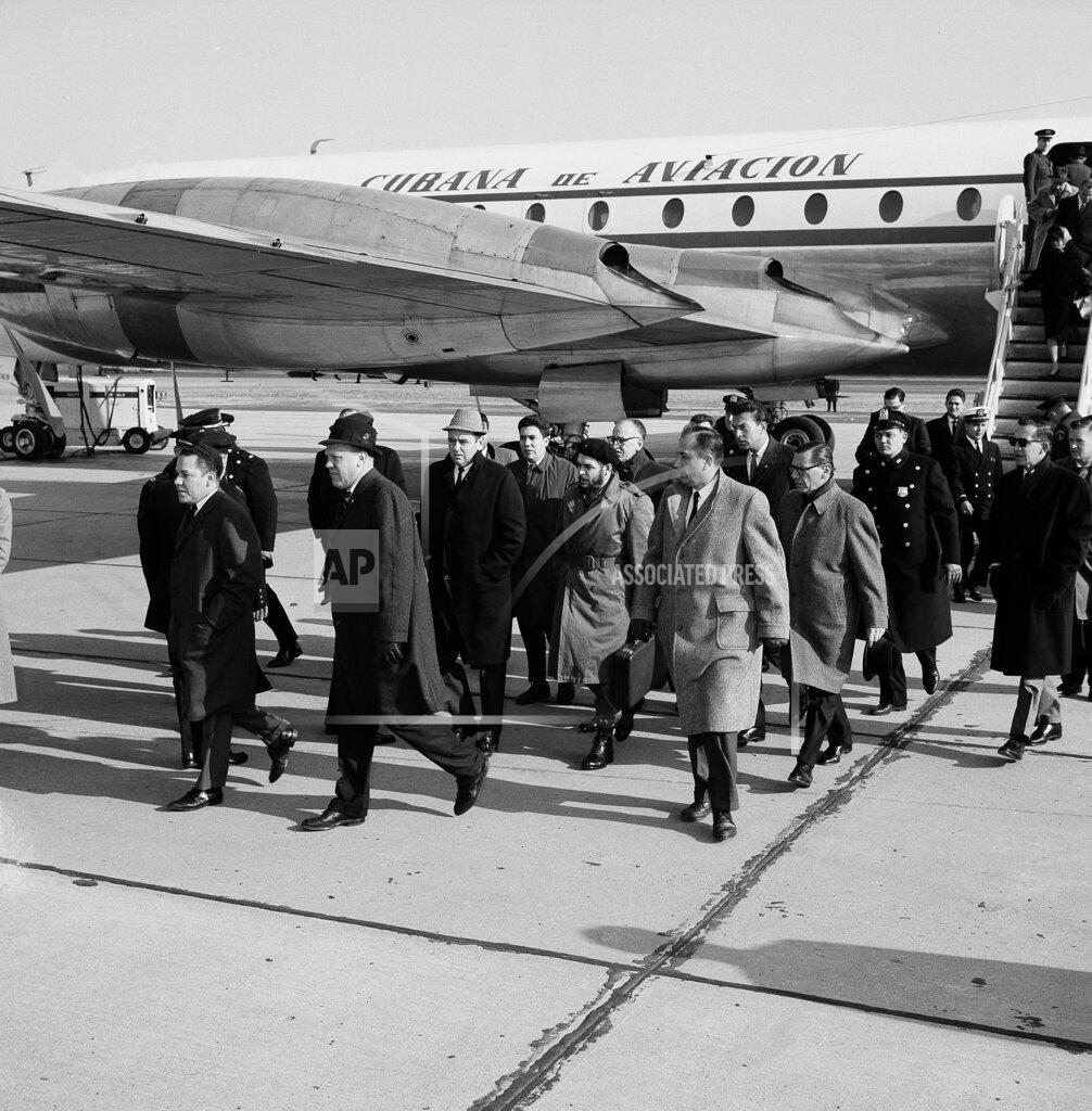 Major Ernesto Che Guevara, Cuban Minister of Industry, arrived in New York from Havana yesterday to take over, temporarily, the leadership of the Cuban mission to the United Nations and to address the United Nations General Assembly Friday. A heavy security guard of airport and city policemen was waiting when Major Guevara’s plane, a Cubana Airlines Britannia, on a special flight, landed and taxied to a cargo area more than two miles from the International Arrivals Building at Kennedy International Airport. Fifty policemen stood guard as the party was cleared by customs, immigration and health inspectors. After 10 minutes, Major Guevara appeared, clad in an olive drab military fatigue uniform with beret, a long trench coat and highly polished black boots. Walking with military bearing, he raised his right arm in greeting to a party of newsmen held behind police barricades and then entered a black limousine. His car drove immediately to the headquarters of the Cuban mission, 6 East 67th Street, where he began a round of conferences.