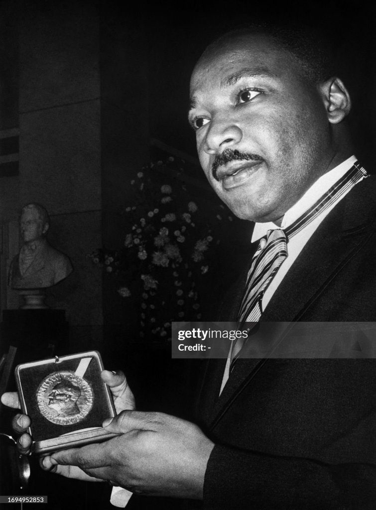 Martin Luther King, Jr. was presented the Nobel Peace Prize in Oslo for his work in the American civil rights movement. Dr. King commented, “I must ask why this prize is awarded to a movement… which has not won the very peace and brotherhood which is the essence of the Nobel Prize. I conclude that this award, which I receive on behalf of that movement is profound recognition that nonviolence is the answer to the crucial political and moral question of our time— the need for man to overcome oppression and violence without resorting to violence and oppression.”