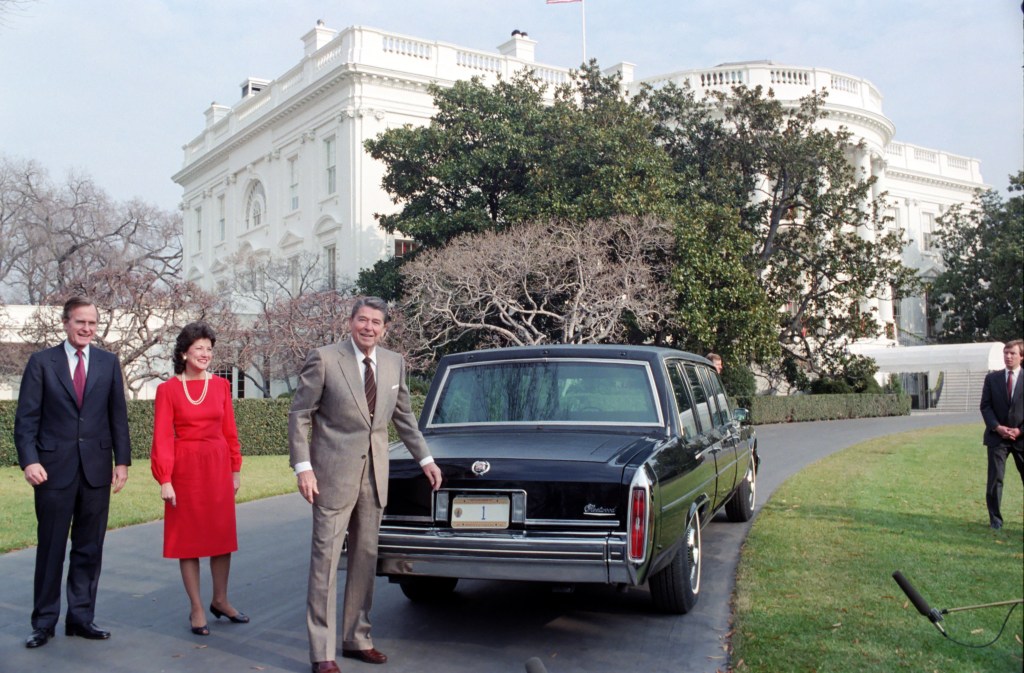 President Reagan and Vice President Bush participate in a ceremony to receive 1985 Presidential Inaugural license plates.