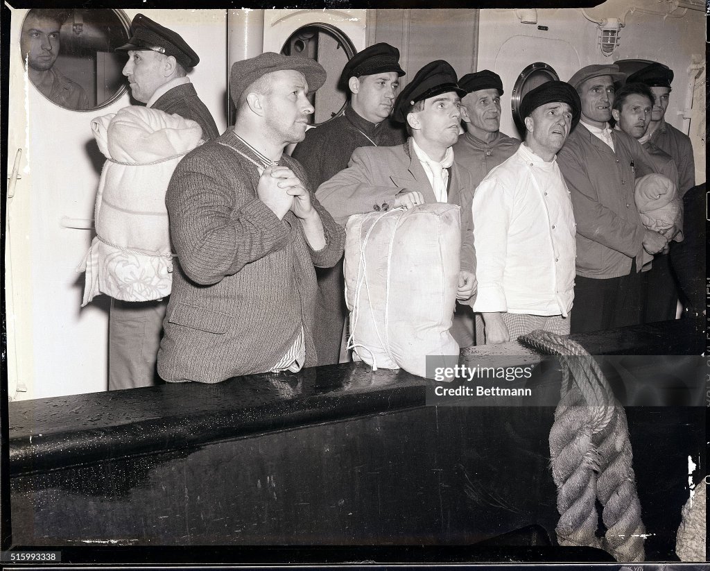 Heavy cruiser USS Tuscaloosa disembarks scuttled German passenger liner SS Columbus’s 579 “distressed mariners” at Ellis Island immigration center in New York.